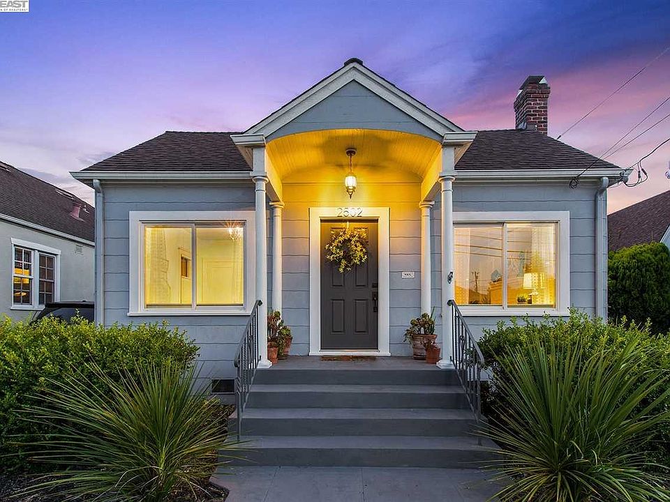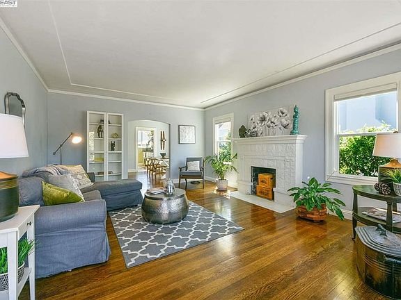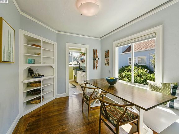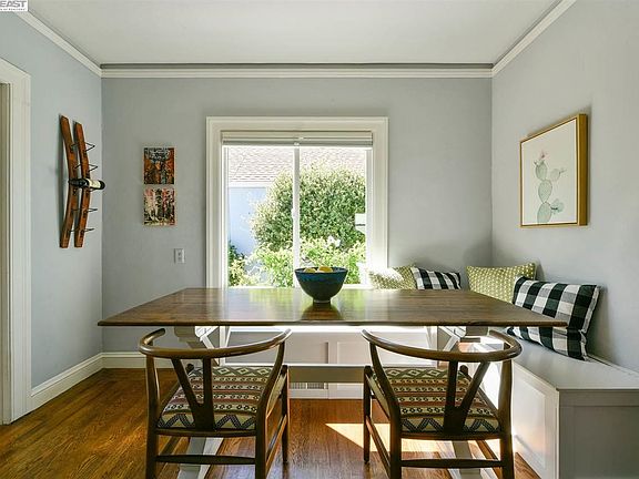 Ultra charming cottage with original Art Deco era architectural details and stylish modern upgrades. Gorgeous hardwood floors and inset ceilings in living room. Dining room with built-in corner hutch and banquette seating. Updated kitchen with classic white cabinetry, stainless gas range and dishwasher, deep stainless sink and chic subway tile splash. Updated bathroom with new vanity, gleaming white tile and rain shower head. Dual pane windows and custom window coverings. Large, sunny yard with lawn area, raised vegetable beds, a mature lemon tree and lots of outdoor seating--all perfect for entertaining on summer nights. Spacious detached finished garage and long driveway. Close to South Shore shopping and beach, top schools, Park Street restaurants.