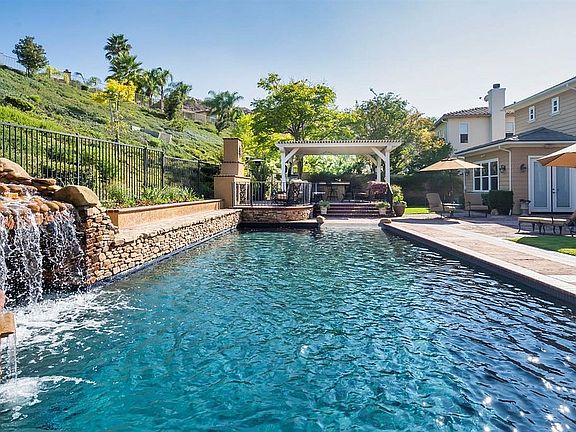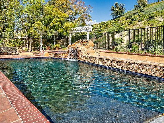 Feel right at home in this 5 bed plus pool room home in Southern Oaks, a great community with excellent schools tucked in the mountains surrounding the Santa Clarita Valley yet minutes from the 5 Fwy. The resort-style backyard offers a pool, grotto and raised spa surrounded by fruit trees and a grassy area. A cabana with a large island, a grill, refrigerator and sink makes outdoor dining easy. An entertainment room offers a pool table and a drop-down movie screen with recliner seating. Step inside and take in the new carpet, crown molding, plantation shutters and recessed LED lighting. The main level offers a formal dining room, executive office, fireside family room, gourmet kitchen, dinette area, wine bar, and main level bedroom and full bath with walk in shower. The second level features a master suite with a fireplace, balcony access, a soaking tub, large walk-in shower plus three guest rooms! A long driveway, a 2-car garage and a separate 1-car garage (can be a guest suite) make parking easy. Two A/C units (1 newer) and a Quiet Cool fan system keep you comfortable all year! The outdoor pool room has it's own a/c unit as well! Residents enjoy access to an HOA pool and clubhouse. No Mello Roos!