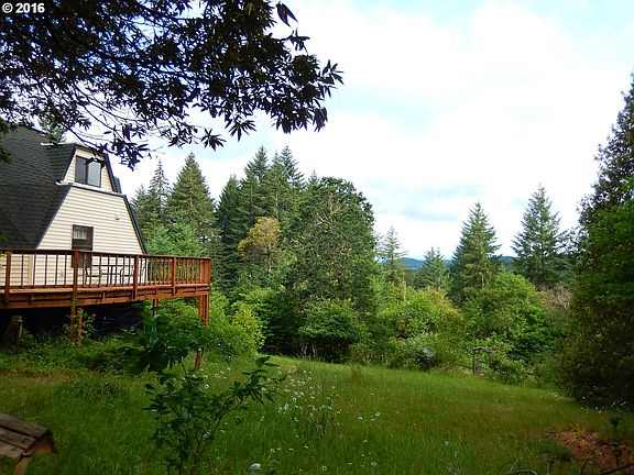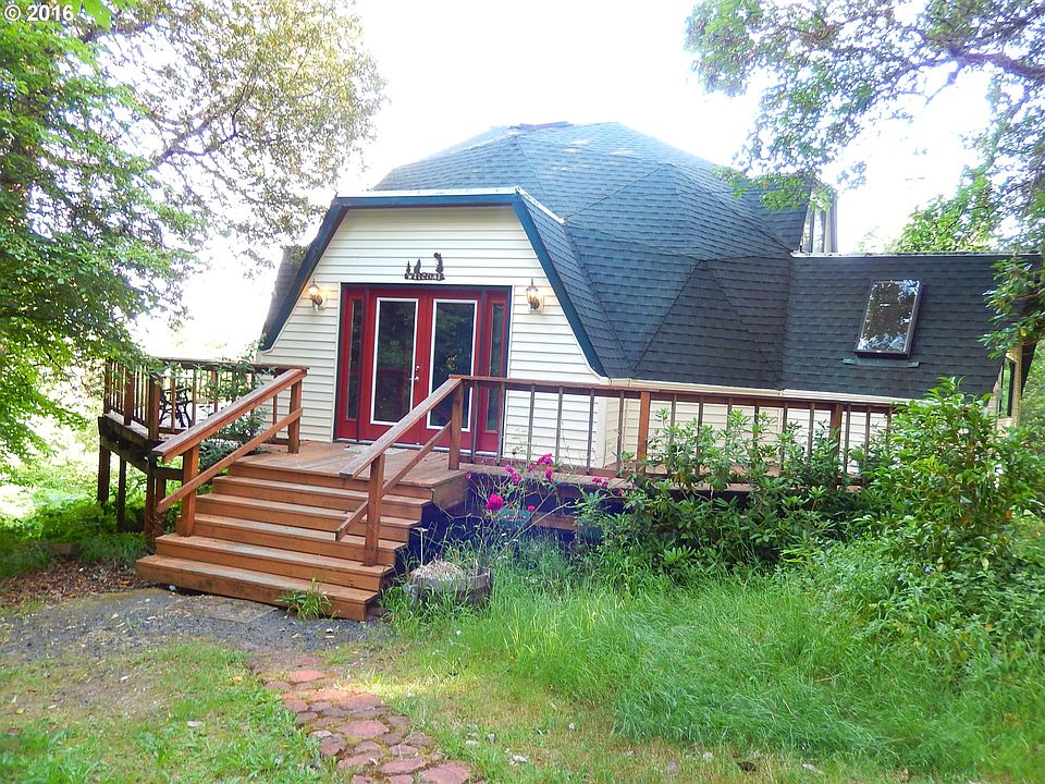 Unique setting and home.Trees surround you with expansive decks and views all around.Dome house with high ceilings and character.Kitchen w/all appliances and eating area.Living room has pellet stove and slider door leading out to fantastic view.Two downstairs bedrooms,one that has a slider onto the deck.Upstairs master suite w/ bath and loft feel.Exterior with 2 carport structures.Mostly fenced and small barn.