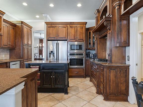 Welcome to this beautifully maintained Edmond home in the picturesque neighborhood of Asheford Oaks. This expansive residence offers a rare blend of comfort, space, and natural beauty. Step onto the upstairs balcony or downstairs patio to experience views that seamlessly blend with nature, creating a serene atmosphere perfect for relaxation or entertaining guests. Boasting 5 true bedrooms and a potential 6th including built-in bunkbeds and a bathroom, and 5 garage spaces, this home is ideal for a large family or those who love to host. The kitchen is a chef's dream with a large wet island and an above-average sized pantry, ensuring ample storage and convenience for all your culinary needs. Additional rooms include an office for remote work, a formal dining area for special occasions, a theater room for entertainment enthusiasts, and a walkout basement providing versatile space for various activities. Asheford Oaks offers a wealth of amenities including a basketball court, community pool, and several parks, ensuring plenty of opportunities for recreation and enjoyment. Don't miss out on the opportunity to make this stunning property your own. Schedule your private tour today and envision the lifestyle awaiting you in this Edmond gem.