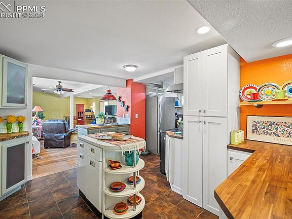 Relax and unwind in your beautiful Ranch home in a well-established charming neighborhood on the west side. Ridiculously easy access to I-25, with a great hiker/biker trail just out the door. This gorgeous Spanish-Style Stucco home is at the end of a cul-du-sac, with a peaceful park-like atmosphere. Enjoy the shade on hot summer days in the midst of it’s treed splendor! Entertain family and friends with barbecues and bonfires in this large, fully-fenced backyard with patio area perfect for hosting large groups. Lot is so large you could add a tiny home. And, with separate entrances you could turn this home into a profit-making investment. Feel the love poured into this home with beautiful updated kitchen, wood vinyl flooring, large windows, and REAL Stone fireplace centerpieces! Chefs will LOVE the wood block counters, white painted cabinets with soft close, pullouts and dovetail construction. Stainless steel appliances and white subway tile backsplash. Great room features a large stone fireplace. Super convenient Main Level Living also includes: Oversized Family room, 3 additional bedrooms, 2 bathrooms, and laundry on the main level. Basement is large with plenty of room for storage and built in shelving! Garage is extra deep and includes built in shelving. 2020 Roof system is wind and hail proof, new doors, new windows, and 2023 Furnace AND Air Conditioning. Bring your RV as this has ALL the hookups! And, plenty of space in this large corner lot with a double corner gate to park ALL your toys behind the fence! This is an excellent home worthy of an investment for anyone! Schedule TODAY. It won't last!!!