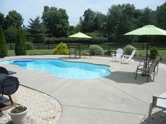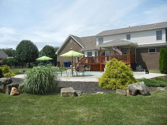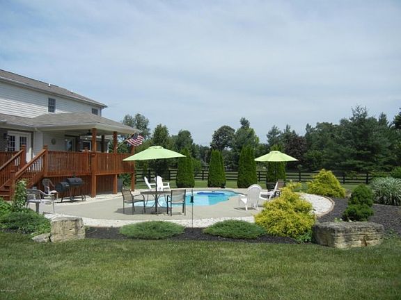 Location, location just 5 minutes off I-71 in the heart of Oldham County tucked away on a cul de sac lot. Beautiful well maintained 4BR/3.5BA brick home with over 3400 sqft on 3/4 acre backing to common area with 2 story foyer, vaulted & trey ceilings. Hardwood in 18' family room along with lots of natural light, a gas fireplace, crown molding and 2 atrium doors that lead to the large covered deck. Kitchen boasts solid surface counter tops & custom 42'' tall cabinets. Hardwood in formal dining room with tray ceiling. Popular 1st floor vaulted master suite has luxurious ceramic bath w/whirlpool tub, designer tile floor and big step-in shower. Three large bedrooms and a full bath upstairs along with a 600 sq.ft. walk-in storage area that could be finished for another bedroom or playroom. Open lower level with family room, game room area and full bath and small unfinished area for additional storage. Move in just in time to enjoy the ingound 30'X14' free form Laguna heated pool. Flat back yard has 4 board fenced and 23' covered deck. Oversized 2 car 23' wide garage. Zoned HVAC, security system and central vac. Award winning Oldham County schools-where your student goes to their neighborhood school.