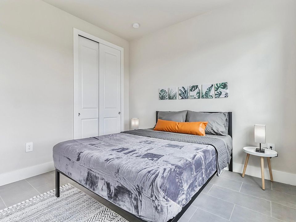$1,100 Queen Room: Queen bed + shared bath (dual sinks + tub/shower)