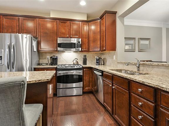 Beautiful townhome in ideal location! New carpet, upgraded hardwoods, high-end plantation shutters & blinds throughout. Stunning eat-in kitchen w/ granite counters & island, stainless appliances & a view to the family room. Juliet balconies make it bright & airy. Spacious master bath has his & hers vanities, garden tub w/ separate shower & huge walk-in closet. California closets in both upstairs rooms! Full bath w/ terrace level bedroom. Private deck & fenced backyard. Community pool great for entertaining. Low Cobb Co taxes! Fenced dog play area & active HOA.