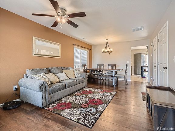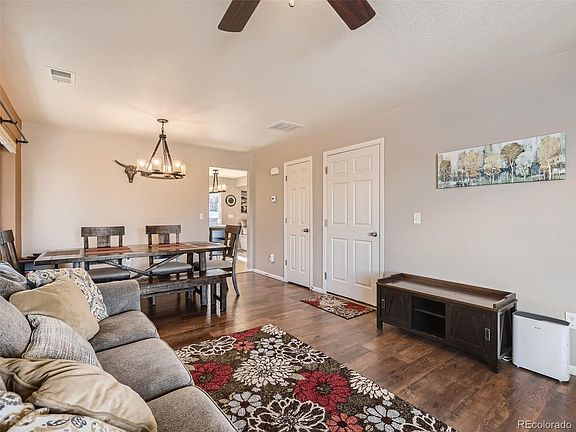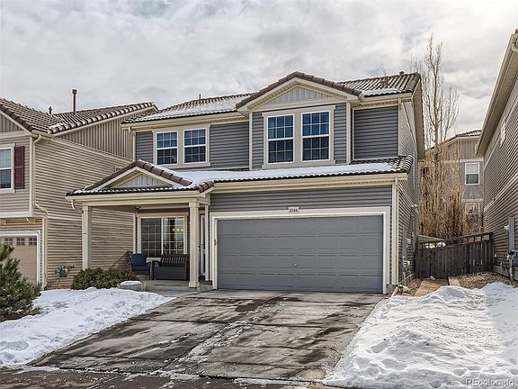 Welcome to this 4 Bedroom, 3 Bathroom home boasting a low maintenance exterior and fronting to open space within The Meadows Community of Castle Rock! Inviting covered front porch, bright interior and a casual open floor plan provide the backdrop for this home’s comfort and livability. Living/Dining Room features updated flooring and designer lighting providing ample room for entertaining or hosting family gatherings. The heart of the home features a spacious Family Room and Kitchen outfitted with stainless appliances, eating area and access to the outdoor private fenced yard. 2-Car oversized Attached Garage! The upstairs living area showcases newer Stainmaster carpet throughout, convenient Laundry closet with washer/dryer included, Full Bathroom, 3 generously sized secondary Bedrooms each with ceiling fan and large closet plus a Primary Bedroom complete with cozy electric fireplace, walk-in closet and en-suite Full Bathroom. You will enjoy the low maintenance exterior of this home featuring vinyl siding, concrete tile roof and Xeriscaped landscape with private fenced yard, backyard astroturf, storage shed and extended patio with gazebo providing a tranquil oasis for relaxing or casual outdoor living! A short .3 mile walk to The Grange community pool plus miles of biking/walking trails steps from your front door. Excellent Castle Rock location with easy access to Ridgeline open space, area schools, I25, Downtown Castle Rock, Santa Fe Drive, Outlet shopping and dining. Don’t miss the opportunity to be a part of this vibrant community!