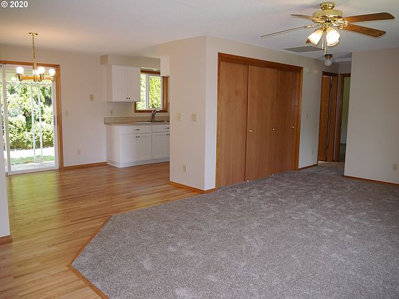 Upgraded and move in ready! Gorgeous hardwoods run from entry through updated kitchen and dining area. New carpet throughout living room and bedrooms, nicely updated bathroom, abundant storage and closet space throughout. Fully fenced yard, covered and paved RV parking, storage shed/mini workshop w/benches and heater, covered patio and mature landscaping.