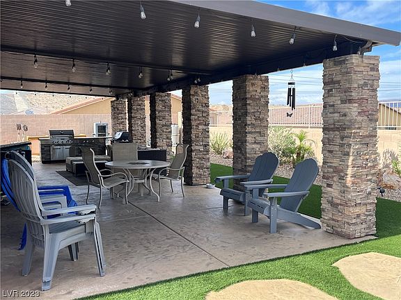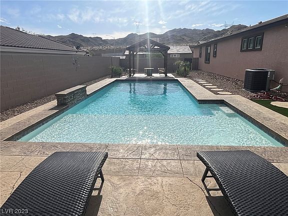 Resort style back yard, large pool surrounded by water feature and stone work. All concrete in back yard is stamped and stained for the upscale finished look. Synthetic grass and 2 covered patio sitting areas. Elevated lot with amazing views of the mountain range. Over 50' of RV parking behind gate. RV parking has full hook ups, 50 amp service and a clean out. Once your inside this home is 5 years old and shows like a model. Modern open layout, granite counters with tile backsplash. 4 bedrooms and 3 baths just over 2000 sq ft. All kitchen appliances and washer dryer included.