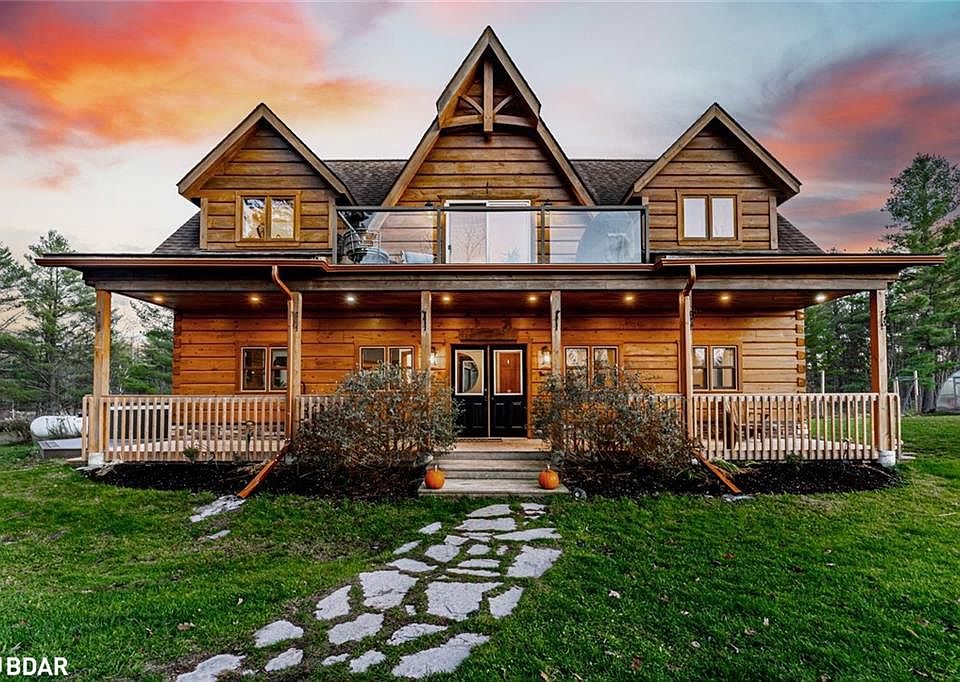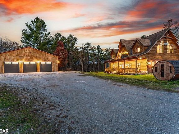 100 ACRES OF NATURAL BEAUTY & A LUXURIOUSLY UPDATED LOG HOME WITH OWNED SOLAR PANELS & VERSATILE OUTBUILDINGS INCLUDING AN OVERSIZED HEATED TRIPLE CAR GARAGE, A SAUNA, SHED, 26FT PLANTA METAL GREENHOUSE, CHICKEN COOP, PUMP HOUSE, A HUNT CAMP & BUNKIE WITH A KITCHEN, BATHROOM, HEATING & A/C! Experience true country living in this log home tucked away on 100 acres with ponds, trails, and forest views, offering the ultimate in peace, privacy, and natural beauty. Showcasing timeless rustic charm, this home features a freshly re-stained log exterior and a full-length front porch, perfect for taking in the serene surroundings. Possibilities are endless with the bunkie- ideal for business or rental use and potential for severance (subject to township approval). Outdoor living shines with a sauna, hot tub, chicken coop, fruit trees, garden beds, and a summer gazebo for unwinding in the fresh air. The main level features a cozy family room with a propane fireplace, two bedrooms with walkouts including a luxurious primary suite with a 5-piece ensuite, a 3-piece bathroom with heated floors, and a flexible office space. The upper level boasts vaulted ceilings, engineered hardwood, and an open-concept kitchen and dining area with quartz counters, tile backsplash, a large island, and stainless steel appliances. The great room features a wood fireplace, statement windows, and a balcony walkout with forest views, plus an additional bedroom and a renovated 5-piece bath. Recent upgrades include fresh interior paint, LED lighting, refinished stairs, newer door hardware, efficient windows, central vac, and a water filtration system. A solar panel system with battery backup and generator hookups ensures dependable off-grid capability, while newly added Bell Fibe internet keeps you seamlessly connected. Discover the ultimate retreat where luxury, modern comfort, and nature unite in perfect harmony, creating a truly exceptional #HomeToStay.