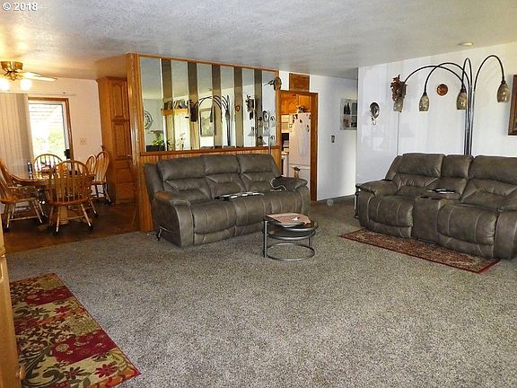 Bring your animals to this 4.85 acre, 3br/2.5ba home just a few miles from town. 1950 sq ft comfortably updated ranch-style home with large living room, kitchen has eat bar. Covered patio. 1500 sq ft shop, numerous outbuildings and level acreage. On city water plus well for critters. Creek runs thru property. Fenced & X-fenced. RV parking. Owner has had a muffler business on site for many years. Will consider training new owner.