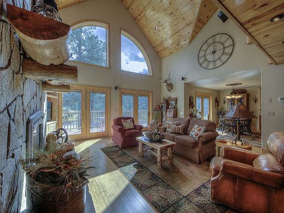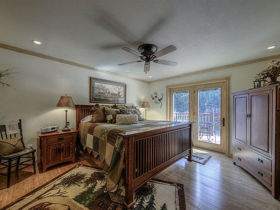 This top of the line home (3 BR, 4 bath, 2 car attached garage) is located on one of the most private lots in the area! Bordered on two sides by National Forest, & host to an almost 2-1/2 acre spring-fed, yr.- round pond, this property is a show stopper! The acreage is enhanced by a 2400 sf metal barn with cement floor, 2 full RV hook-ups (septic, electric, water), an inviting potting shed, & a gazebo for pond gazing. Main floor boasts a beautiful master suite with large bath (jetted tub), & large walk-in closet; vaulted ceiling living room with soaring propane fireplace, eat-in kitchen with all the amenities serious cooks require; laundry & 3/4 bath. The bamboo wood flooring runs throughout the main floor. The open log stairs lead to the loft sitting room, bath, & two carpeted bedrooms. All closets in this bouse are generously sized and additional storage is tucked in everywhere possible. The fully finished basement family room has over 1400 sf office/game/TV room, + 4th bath!
