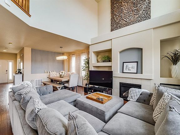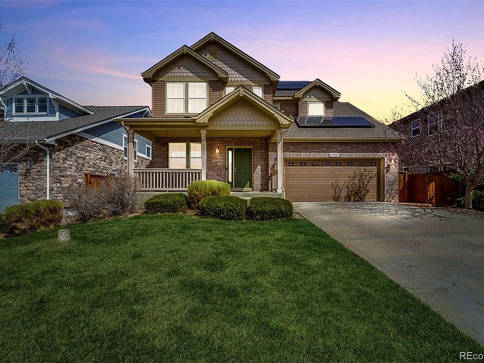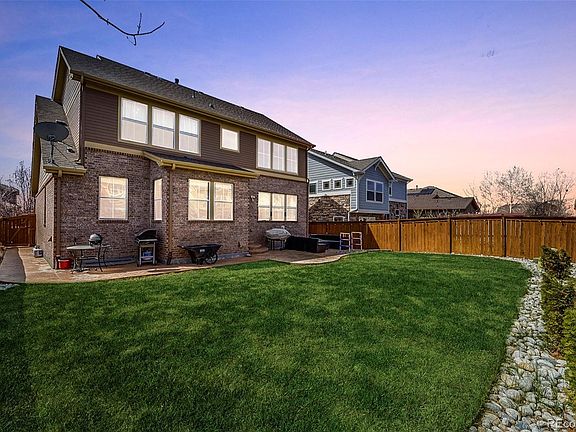 Walk along the many trails to awesome K-8 and 9-12th grades Vista PEAK Campuses, Traditions Neighborhood Park & Skate Park, Tennis Courts and Club House with Pool. Stylish home with wide open floorplan. Perfect for entertaining and living. Gleaming floors with a fireplace welcome friends to relax and stay. Living room, dining area, family room and kitchen are wide open and allow easy access to the beautiful fenced backyard. The kitchen is well appointed and complete with electric cooktop, plenty of beautiful cabinets, countertops galore with island that seats 4+. Main floor office. Upstairs the master bedroom is a true retreat; beautifully appointed with vaulted ceilings, sumptuous on-suite with soaking tub, two sinks, shower and walk-in closet. There are also 2 nice sized guest bedrooms with ample storage which complete this immaculate home. Full, unfinished basement offers plenty of space for storage or future growth! Solar panels are owned so you can enjoy the savings! Its location provides easy access to C-470, Southlands Mall, and Stapleton. In addition, this friendly neighborhood features wide streets, beautiful landscaping and walking trails.