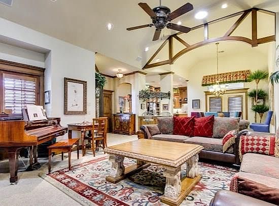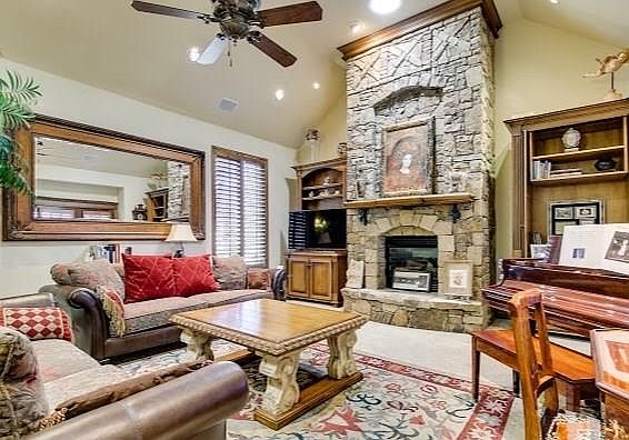 Stunning home in gated neighborhood with lawn maintenance! This beautiful home has a large living with vaulted and beamed ceiling and stone fireplace. The kitchen showcases granite countertops, an island, pantry, wet bar, built-in bench seating and stainless appliances. Spacious study with wood floors and built-ins. Master bedroom has a charming fireplace and large walk-in closet. Step outside to a private back yard patio and enjoy a beautiful fountain in the front yard with extensive landscaping. Double gates for privacy and security in Capri at Borgata.