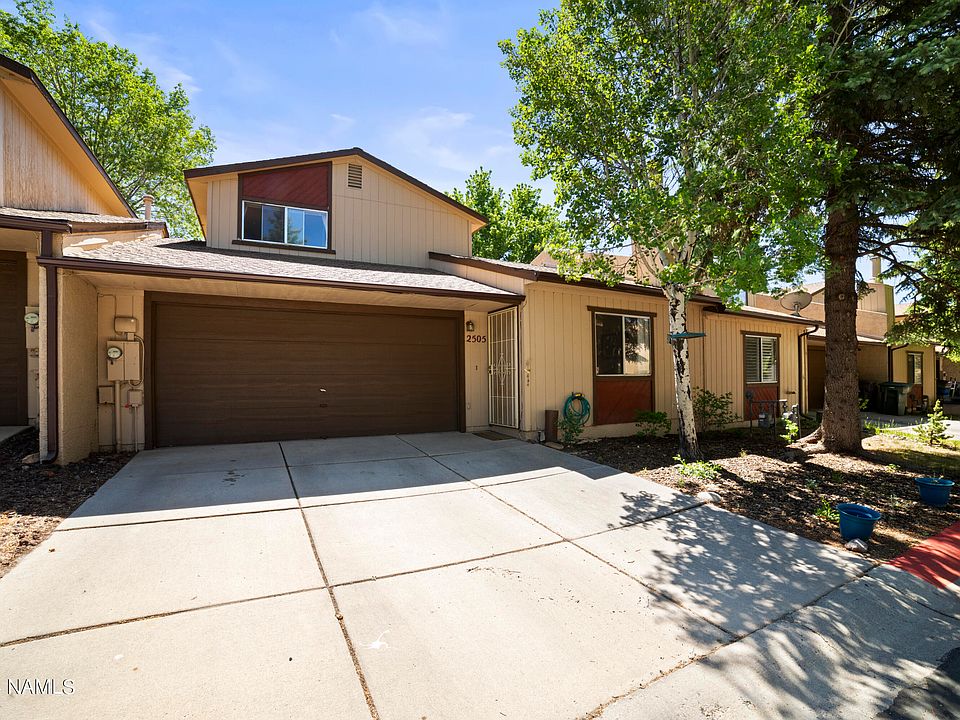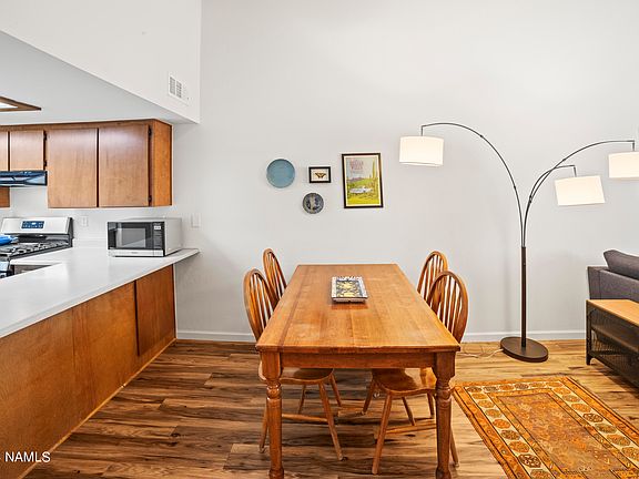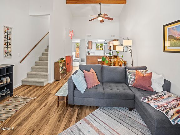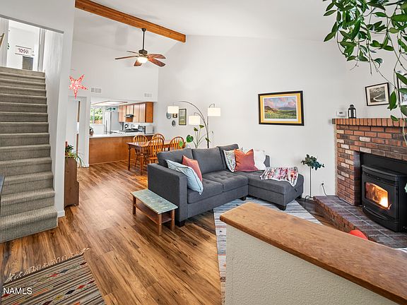 This livable floorplan features 3 bedrooms, one on the main level and two on the second level, along with 2 full baths, two car garage & a lovely rear yard space that backs to single level homes, rather than 2 story homes, creating more outdoor privacy than most of the townhomes in the subdivision. The owner is a gardener, and an outdoor space was created for relaxation under a mature leafy tree with blooming planter beds surrounding it. Native plants, strawberries & herbs can be appreciated during Flagstaff's growing season. Imagine an affordable home in Flagstaff, centrally located to the amenities our charming mountain town offers. New vinyl plank flooring, interior paint, gas stove, refrigerator, landscaping & an efficient pellet stove have all been added in the last 4 years!