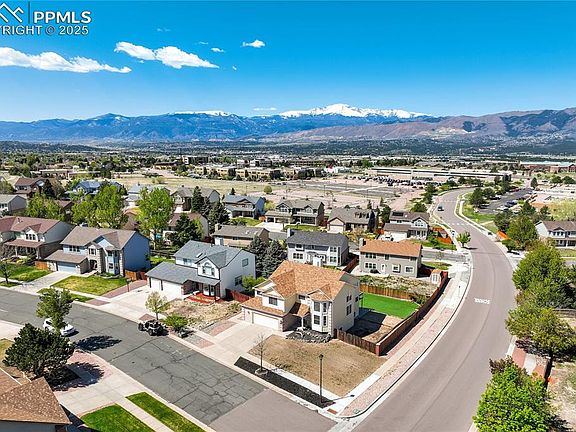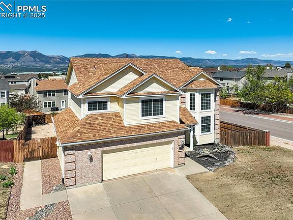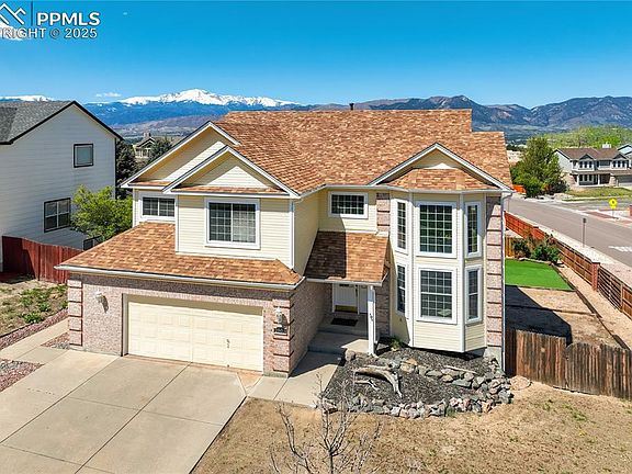 Breathtaking Views, Dramatic Design, and Exceptional Comfort—All with No HOA. Set on a spacious .22-acre corner lot with panoramic views of Pikes Peak and the Front Range, this striking Briargate residence combines architectural drama w/everyday livability. From the moment you enter the Italian-tiled foyer, you're greeted by soaring vaulted ceilings, walls of windows, and an incredible sense of light + space. The open-concept design invites you to linger, w/brand-new carpet + paint, updated modern lighting + a seamless flow between living, dining, and entertaining areas. The spacious eat-in kitchen features stainless steel appliances, granite tile countertops, Italian tile flooring + center island. Just off the kitchen, the inviting family room centers around a beautiful gas fireplace with a custom mantle, offering the ideal backdrop for cozy evenings in. Upstairs, your private retreat awaits in the generous primary suite with mountain views and a luxurious 5-piece bath. 3 additional bedrooms + full bath complete the upper level. Downstairs, the finished walk-out basement (2019) expands the possibilities w/stained concrete floors, a wet bar for entertaining + is plumbed for a future fireplace. Extensively upgraded for peace of mind + efficiency: Class 4 Roof + gutters (2016), high-efficiency furnace w/humidifier, central A/C (2016), double-insulated siding on windward sides (2015), energy-efficient windows + sliding doors (2010) + Wood Deck to enjoy the mountain vistas. The fully fenced backyard is ideal for pets or play, with steel posts + side gate access—perfect for storing a trailer or recreational toys. Best of all, this home is just minutes to award-winning District 20 schools, scenic John Venezia Park and offers unbeatable access to hospitals, dining, shopping, and I-25 for an effortless commute to downtown, military installations, and beyond. A rare opportunity to enjoy luxury, location, and freedom—all with no HOA + Potential for an amazing Assumable Loan!
