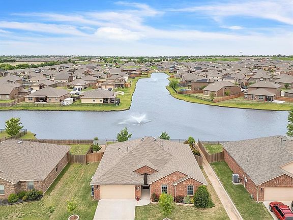Serene waterview living in the Homestead at Horn Valley neighborhood and Yukon school district. This four-bedroom, two-bath home overlooks the picturesque neighborhood pond with a prime view of the floating fountain - truly an amazing opportunity - it's the first thing you'll see when you enter the house and are greeted by the huge windows overlooking the backyard and water. The pergola sets the stage for the retreat, featuring a custom grill area, pull-down shades for sun protection, a misting cooling system, remote-controlled fan, ambient lighting, and Boston Ivy on the trellis. Whether entertaining or enjoying a quiet cup of coffee, it's an outdoor living area you'll use daily. Overall, this home has numerous updates and features. The full list is attached to the MLS listing in the supplement section, but here are a few: The advanced Rainbird sprinkler system is equipped with wireless connectivity and rainfall detection (it knows when it's raining!), ensuring efficient water usage across seven zones. Custom sprinkler heads nurture the vibrant front and back landscaping, and a self-watering connection simplifies care for the front flower pot. Outdoor living is enhanced with two additional gas lines: one for the grill and another for a potential fire pit in the flower garden, eliminating the need for propane tanks. There is a very nice storage building with motion detector lights, too. Inside, the home is outfitted with several modern conveniences like an Ecobee smart thermostat, Ring doorbell, & a hot water tank under the kitchen sink for instant hot water. The garage offers organized storage with mounted hooks & racks, while a fully wired ADT security system covers all doors and windows, including glass break sensors on the back door. A list of the property's diverse trees and plants is available upon request, enhancing its appeal to nature enthusiasts. Attention to detail and true pride of ownership abound from the smallest touches to the most impactful choices.