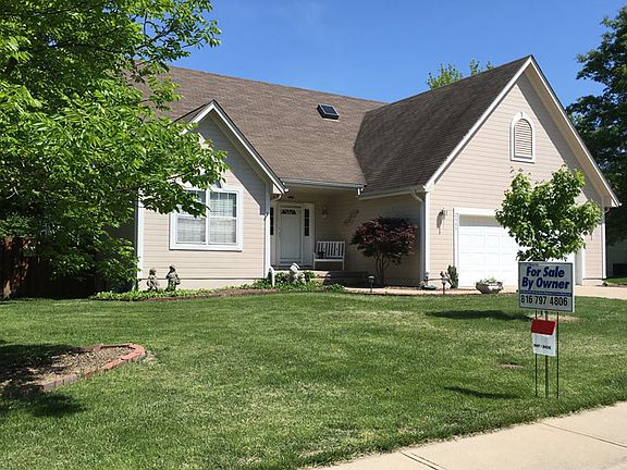 For Sale By Owner. Contact 816-797-4806. Smartly designed 1.5 levels, large 3 bedroom, 3.5 bath home in nice neighborhood. Open floorplan between kitchen, eat-in dining and living areas. Master bedroom and bath. Laundry room with pantry and storage. Formal dining room (currently used as office/den space). Two large bedrooms and full bath on second floor. Large finished basement with additional storage and tornado room. Large decks span full length of back of house. Decorative fish pond in large back yard. Privacy fence. Sprinkler system.