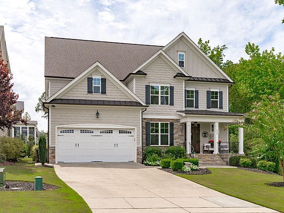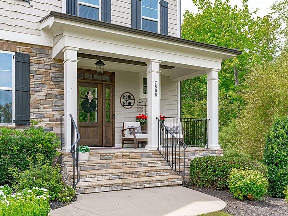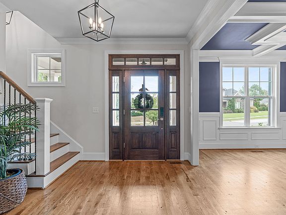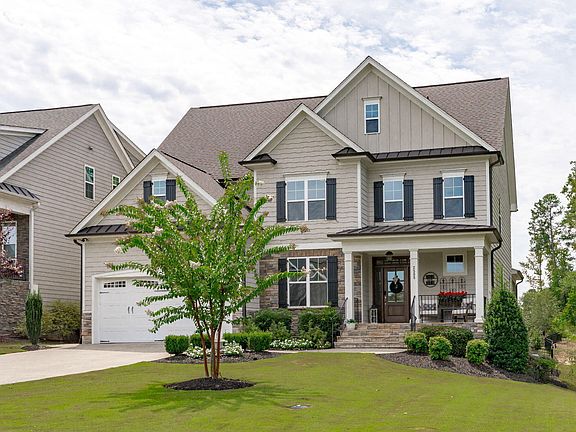 Welcome to this stunning custom-built home nestled adjacent to a protected wooded buffer, offering privacy and serene views in the heart of the highly sought-after Manors at Bella Casa, known for its rich amenities and ideal location. From the moment you arrive, you're greeted by a rocking chair front porch and beautifully landscaped grounds, setting the tone for what awaits inside. Step into a world of elegance with site-finished hardwood floors throughout the main level, bulky millwork including cased openings, intricate baseboards, crown molding, and a coffered ceiling in the formal dining room, perfect for hosting unforgettable dinners. The gourmet kitchen is a chef's dream, featuring a large center island with quartz countertops, two-tone soft-close cabinetry, a stunning tile backsplash, and high-end stainless steel appliances including a wall oven, microwave, and a 5-burner gas cooktop. The kitchen opens seamlessly to a sunny breakfast nook and a spacious family room anchored by a cozy gas fireplace. A luxurious guest suite with a full bath on the main floor offers comfort and privacy for visitors. Nearby, a functional mudroom with a built-in drop zone adds convenience for daily living. Upstairs, follow the oak staircase to find more site-finished hardwood floors leading to a versatile bonus room with French doors, perfect for a playroom, media space, or home office. The primary suite is a private retreat with dual walk-in closets and an opulent bath featuring an oversized shower, soaking tub, double vanity, and a private water closet. Two additional generously sized bedrooms share a designer full bath with high-end finishes. Need more space? 1000 square feet of incredible unfinished attic offers ample room for future expansion. Step outside to enjoy the serene screened porch overlooking a fully fenced, large, and usable backyard, ideal for play, entertaining, or peaceful relaxation. All this within walking distance to top-rated schools and just minutes from historic Downtown Apex, Publix Pointe, Beaver Creek Shopping Center, and steps from Apex Nature Park and athletic fields. Don't miss this rare opportunity to own a truly exceptional home in one of Apex's premier communities!
