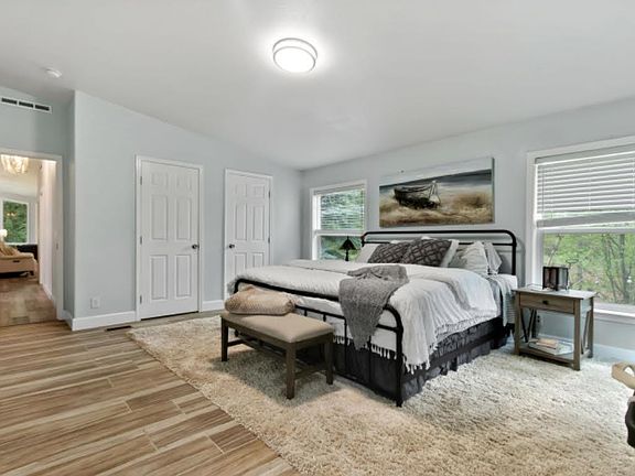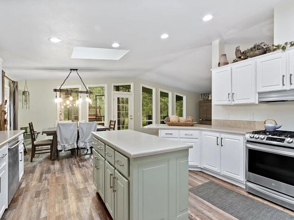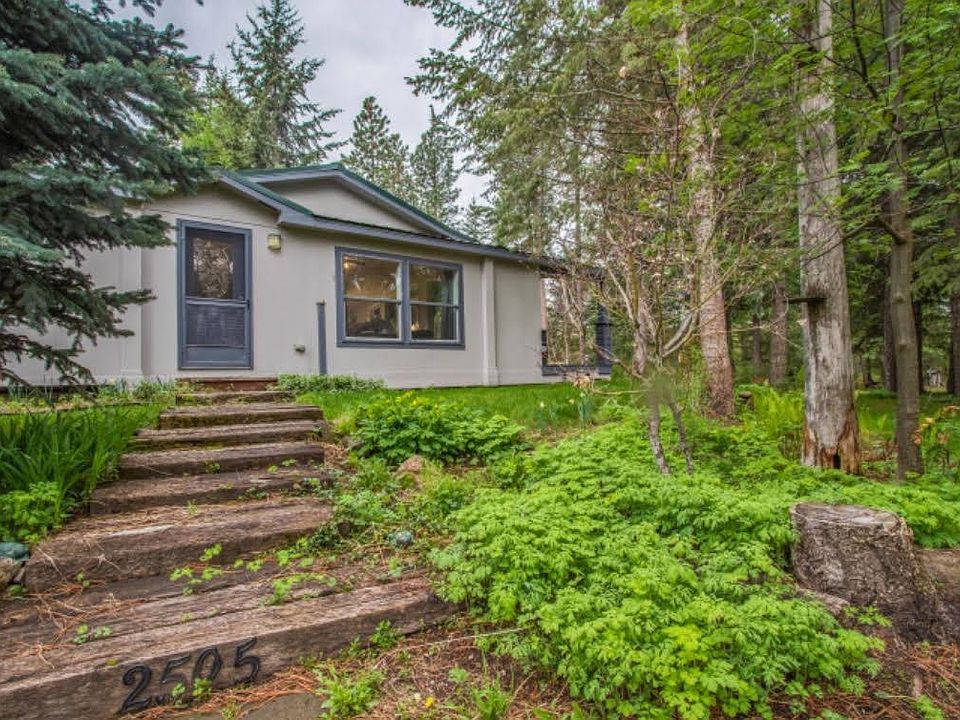 Beautifully updated 3 bedroom 2 bath manufactured home with vaulted ceilings and open concept floor plan exudes privacy and pride of ownership. All 12.65 acres are level, treed and maintained with groomed trails throughout. The well is 50+ gpm which keeps the yard and landscape green and beautiful even in this dry season. Two car detached garage with covered breezeway enters the home at an oversized mud/utility room with convenient bathroom and kitchen access. Corian countertops, custom cabinets and skylights make the kitchen very warm and usable. The home was custom designed with oversized windows with low sills creating picturesque views. All 3 bedrooms have double closets. Primary suite has large bathroom with a garden tub, stand up shower and skylights. There are 2 additional carports.