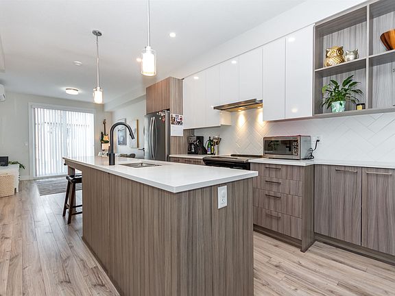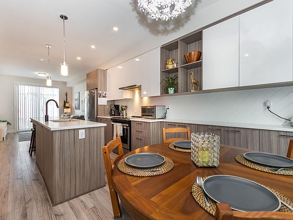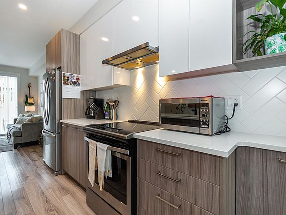 Modern & innovative designed townhouse in Mill District. Bright, 2 bedroom floorplan features an open-concept layout, expansive windows, generous 9' ceilings & energy-efficient A/C. Kitchen features flat panel cabinetry in a dark colour scheme, polished quartz counters, herringbone tile backsplash, soft-close doors, polished chrome hardware accents, and a spacious kitchen island w/eating bar. Includes appl's, 2" faux wood blinds, 2 air conditioners. Master suite has spacious WIC, elegant frameless glass shower enclosure & 2 sinks. 2nd bedroom also has an ensuite w/deep-set soaker tub, dual-flush water-efficient toilet w/soft close seat. Tandem secured grg: one-in, one-out parking w/ample storage. Rentals and pets are allowed. (2)