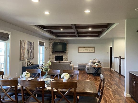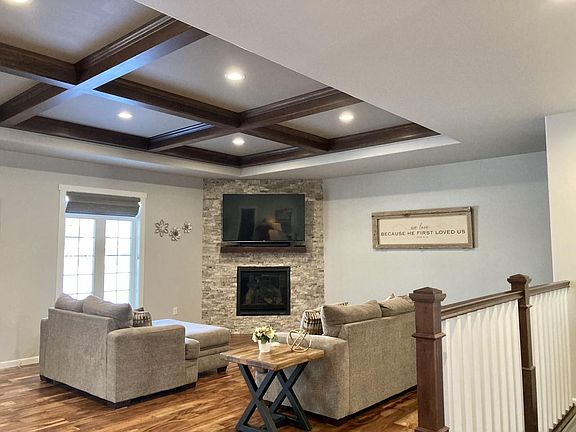 Better than NEW! This stunning contemporary 6 Bedroom 3.5 Bath sprawling Ranch hosts a welcoming open concept layout ideal for entertaining! The generous kitchen features lovely granite countertops, an island, buffet & pantry. In the Living Room you will be greeted with tons of nature light, gorgeous coffered ceilings, & a beautiful gas fireplace. The fully finished lower level hosts an extra large Rec Room with wet bar, projection TV & reading nook. You will love the covered deck, paver patio & beautiful established landscaping!
