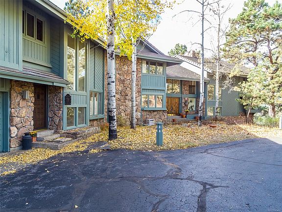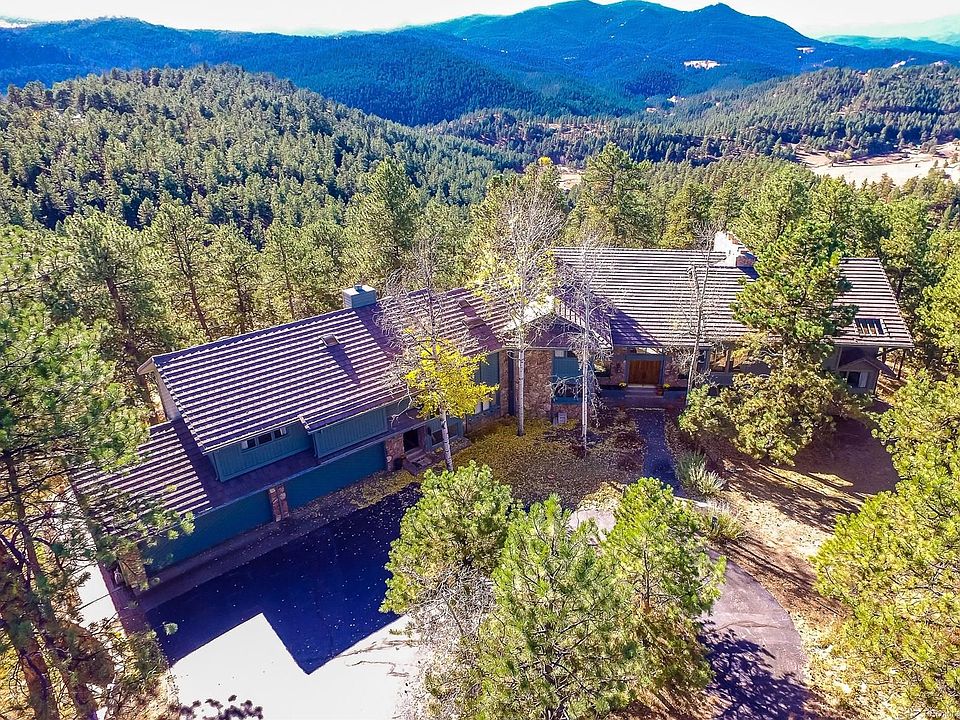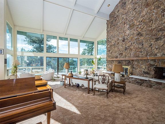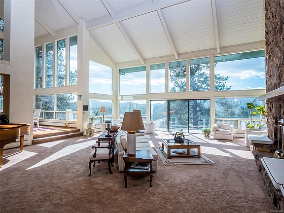 This rare estate represents the best of Colorado living with panoramic mountain views through floor to ceiling windows, thoughtful and open floor plan and situated on a private lot at the end of a quiet road. Breathtaking great room with views of Mt Evans, 2 story vaulted ceilings with a rustic rock wall and fireplace. The updated kitchen features granite, high-end stainless steel appliances including double ovens, 6 burner cook top, prep sink and breakfast nook. The upper level features the master bedroom with fireplace, exposed beams and a large 7 piece bath. Also on the upper level are 4 additional large bedrooms each with attached baths. The walkout lower level has great entertaining space with a wet bar and fireplace for the perfect atmosphere with friends and family. Serene mountain setting on almost 3 acres and with a circle driveway, amazing deck that runs the length of the home. Unbelievable value for this unique and inviting home!