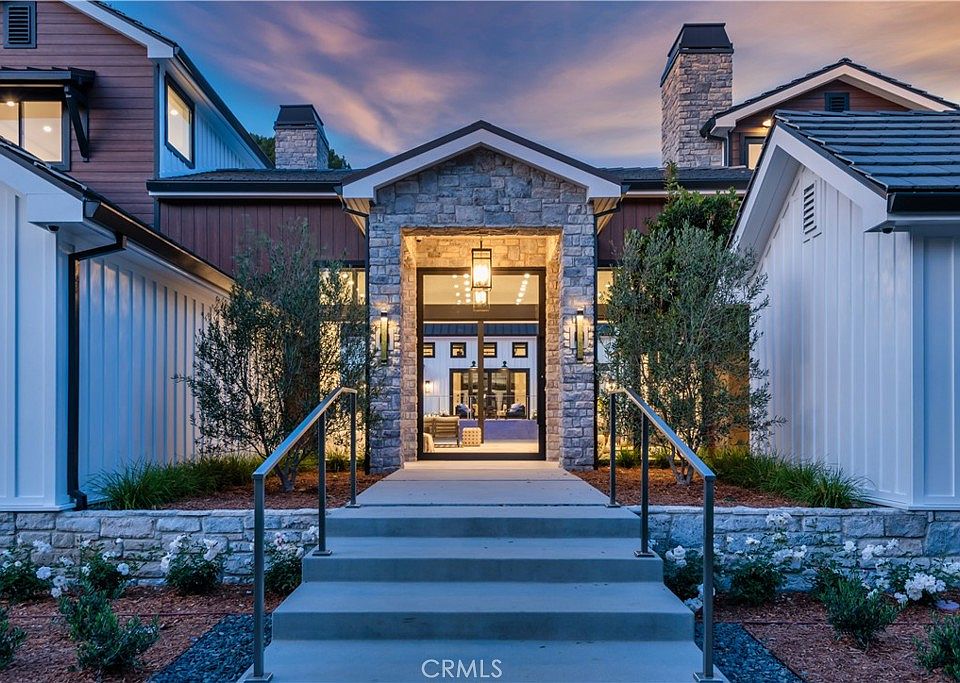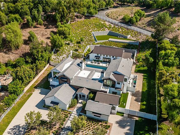 This contemporary estate in the highly sought-after Hidden Hills community redefines luxurious living in California and includes DESIGNER FURNITURE AND ARTWORK. Spanning approx. 8,800 square feet on approx. 1.22 acres, the residence seamlessly combines timeless sophistication with modern design. Step through a grand glass pivot door into a spacious interior featuring impressive 15-foot ceilings and over 40 feet of pocket glass doors that bring the outdoors inside. The open-concept chef’s kitchen is a culinary paradise, showcasing a large center island, top-tier appliances, and a concealed second chef's kitchen. A breathtaking waterfall pool, adjacent spa, and inviting outdoor areas create the perfect backdrop for relaxation and social gatherings. The adaptable party barn is a dream for entertainers, complete with a high-end wet bar, a guest suite, and state-of-the-art entertainment systems. Designed with sustainability in mind, this estate boasts SMART HVAC, a sustainable garden with fruit-bearing trees, a drought-resistant landscape featuring a water reclamation system, and an integrated music system, ensuring every detail enhances both comfort and style. For added security, the property includes perimeter security, a guard and gate, a pre-fire alert system, and advanced security measures for the home and grounds.