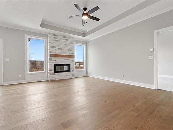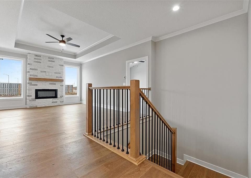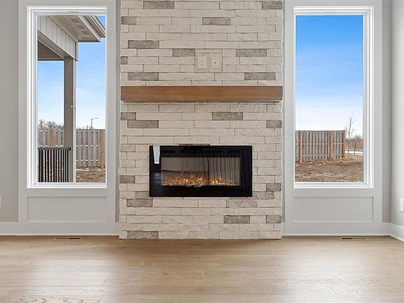 The Newberry by Lambie Homes is a stunning 3-bedroom, 2.5-bath reverse 1.5-story floor plan designed for modern living. Featuring 9’ ceilings on the main level, the open family room showcases a dramatic floor-to-ceiling stone fireplace with a 40" Allusion electric insert and flows seamlessly into the dining area and covered patio/deck which is perfect for entertaining. The main-level primary suite offers a spacious walk-in closet and convenient laundry access. The finished lower level includes a large family room, two additional bedrooms, and a full bathroom - providing plenty of space for family or guests. Located in Mize Hill, Lenexa’s newest maintenance-provided community, residents will enjoy walking trails, future community pool, and close proximity to Cedar Station Park and Mize Lake. Builder Incentives Available – Contact the community agent for details on current buyer savings for homes closing in 2025! Photos are of a model Newberry plan and may depict options not included in this home. Colors, finishes, and style may vary. Home is open Wednesday–Sunday, 12:00–5:00 PM.