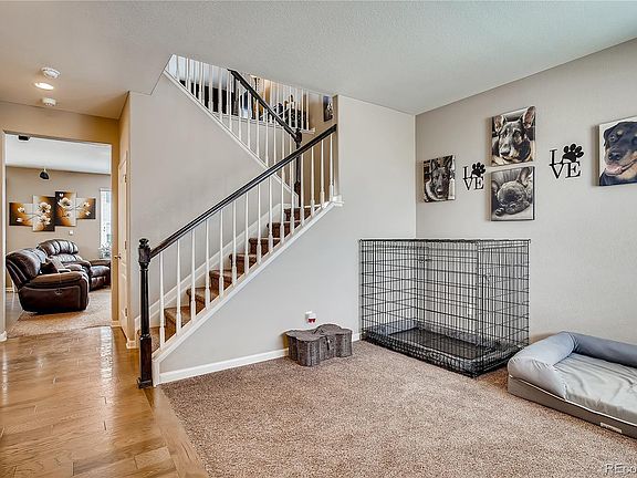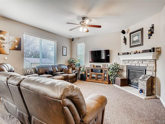 Come see this Fallbrook Farm Gem! 4 bedroom, 4 bath home with Mountain Views! Corner lot on a cul de sac with a plethora of upgrades. Gourmet kitchen with pendant lighting, rollout drawers, spacious pantry and trash receptacle, granite counters, gleaming hardwood floors, cozy living room gas fireplace with blower and stone surround, ceiling fans and whole house attic fan. Eat in kitchen and dining room, loft on upper level and paid Solar Panels! Newer garbage disposal, microwave, water heater and water softener. The finished basement is a bonus with an extra bedroom, 3/4 bath and 2 family room areas. Enjoy your evenings on your back patio or front sitting porch with mountain views on this oversized lot with front and backyard sprinklers and a shed for extra storage. One of a kind home meticulously maintained and hard to find this location. Low HOA and low utility bills. Easy access to I-25, shopping and restaurants.