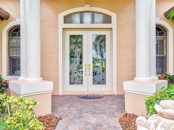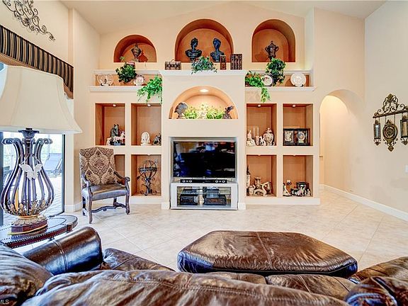 A magnificent home, tile roof, brick pavers driveway, walk-entry & deck. Stained glass doors. Arched entry ceiling. Foyer has a Roman column mirroring a wall rendered by a renowned mural painter. Open living & family layout, tile & solid wood flooring throughout. Built-in entertainment center - lighted arched niches. Den is highlighted with a solid wood unit & a Murphy bed. Spacious master bedroom, tray ceiling, mirrored sliding doors, large closet & an opulent master bathroom designed with Travertine tile. His & Hers vanities, garden tub, "drive-thru" shower and multiple shower heads. The kitchen is well equipped for an enthusiastic chef: Dacor drop-in gas propane cooktop, professional exhausted fans, stainless steel vent-hood emitting to the exterior, warmer tray, convection wall oven & water pot filler. Pantry closet, wood kitchen cabinets, granite countertop & garbage disposal. All windows are tinted glass. Screened integrated salt water pool & spa. Pool bath, outdoor built-in grill (propane) & closet for pool equipment. Auto sprinklers. Security system, water treatment filter (Kinetico System) & hurricane shutters. On City Water & Sewer - Assessments paid. Come and see it now!