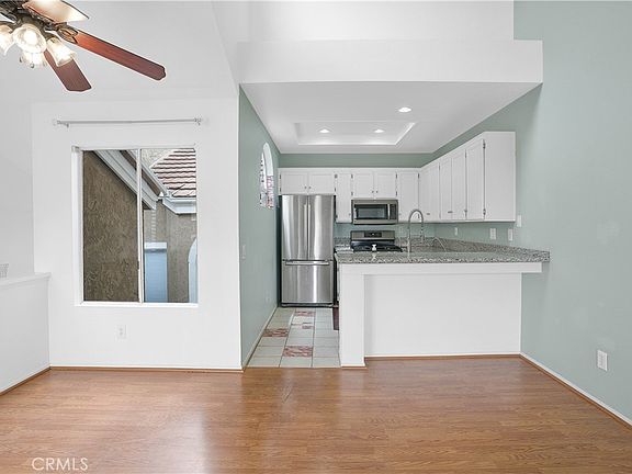 Fabulous one-bedroom + one-bathroom townhome ( no one above or below)located in the Expressions community of Laguna Niguel. Lite & Brite open floorplan with high ceilings. New paint. The kitchen has a granite breakfast bar open to the Living room, a Nuvia water filter, a fireplace in the living room, and access to the balcony. Laminate wood flooring is on the stairs, living room, and bedroom. A newer AC unit and garage door. Garage steps from the front door. The sizeable primary bedroom has plantation shutters, and the primary bathroom has an inside stackable washer/dryer closet, a newer granite bathroom countertop, new sinks, and a shower faucet. A one-car garage is next to the unit. The entire complex has been repiped, the roofs replaced, and the exterior painted. The association's dues cover water and trash.