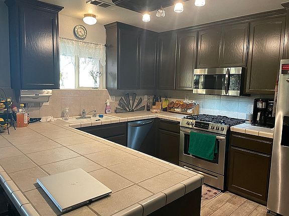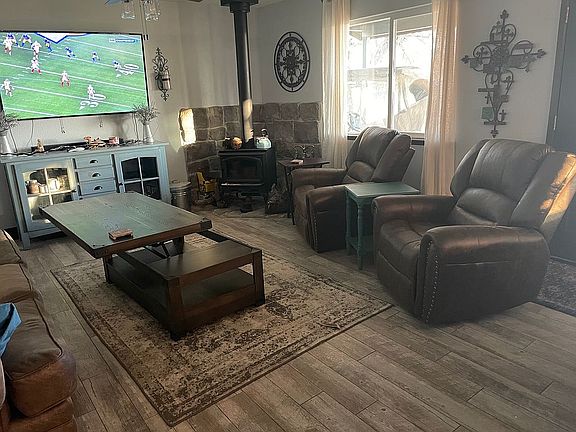 Built in 2002 this 3/2 (do not rely on tax records) has 1355 sq feet. It is situated on 5 usable acres on a knoll bringing in the sweeping views of the Sierra. We purchased this home in February 2019. Since then we have updated all flooring to wood look tile, replaced all baseboards with 5 inch baseboards, painted the entire inside of the house, including all the cabinets, changed out all light sockets, light switches, door knobs and locks and upgraded them to bronze, upgraded all ceiling fans; replaced all window coverings, upgraded all appliances to stainless, added a gas range (stainless), replaced florescent lighting in kitchen with a bronze track light. We have opened the two horse pens up and added a new gate. We are now adding a pole shed for the horses and are completely redoing our arena. It has an open floor plan, the kitchen has good storage with a large amount of counter space. Here you can feed the family at the breakfast bar. There are built-in appliances set up in a convenient configuration. There is a handy pantry too. Adjacent to the kitchen is the laundry room, also with a good amount of storage, sink and counter space. The bedrooms and hall bath are off the living room area and so is the master bedroom and bath. There is a horse set up and outbuildings.