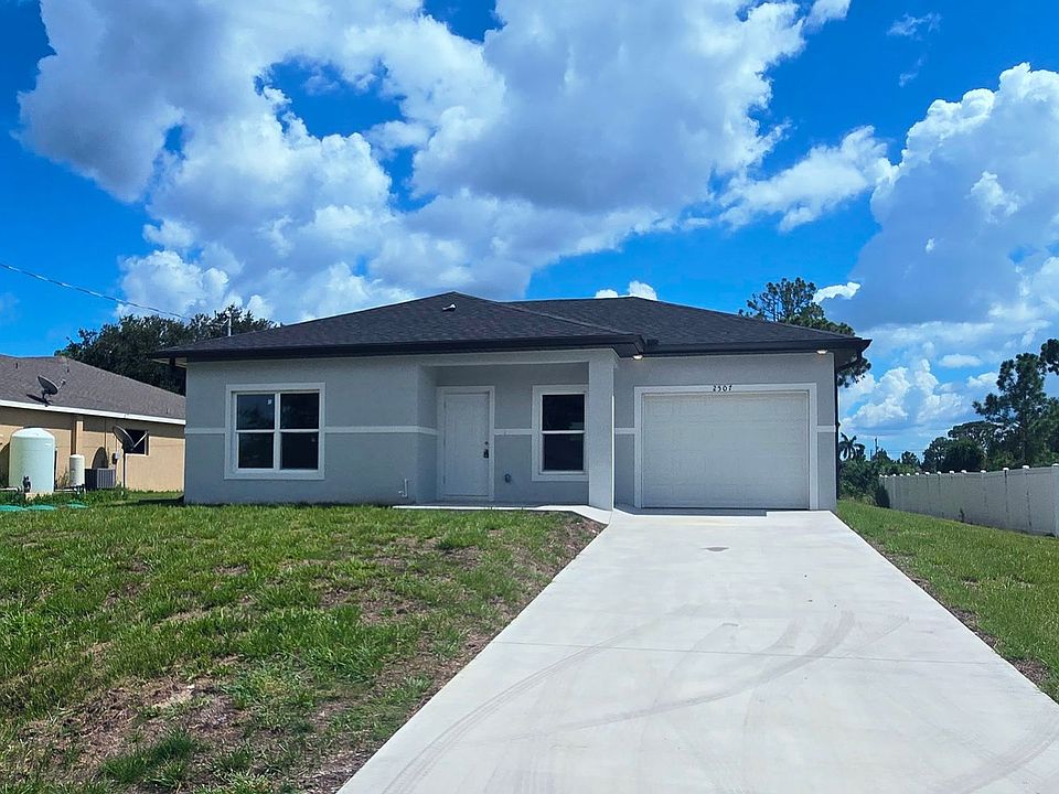 Welcome to your dream home in the best SW location in Lehigh Acres, FL! This BRAND NEW 2/2/1-SW LEHIGH ACRES home is move-in ready and waiting for you to be the first to call it home. The house boasts two spacious bedrooms and two full bathrooms, perfect for comfortable living. The kitchen is a chef's dream with stainless steel appliances, granite counters, plenty of cabinets, and a pantry for extra storage. The open rear lanai and large backyard offer ample space for outdoor activities and pets are welcome too! The home also features a one-car attached garage, washer and dryer hookups, and beautiful tile flooring throughout. The wood shaker cabinets add a cozy cottage vibe to the home. The property is conveniently located close to downtown Lehigh and SR 82, providing easy access to FT Myers. With storm protection-impact windows, this home is not just beautiful but also safe. Don't miss out on this opportunity, SEE IT TODAY! This home is close to all amenities in Lehigh Acres, making it the perfect place to enjoy the Florida lifestyle.