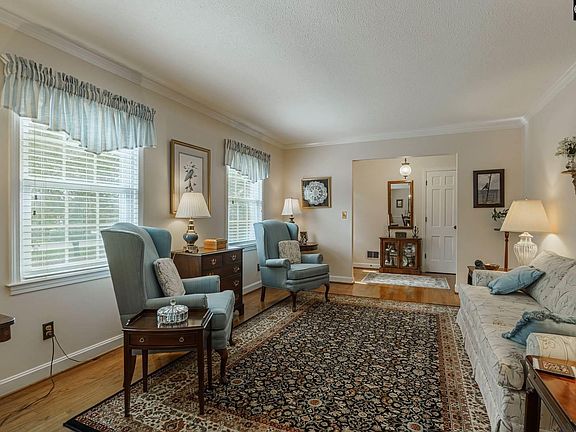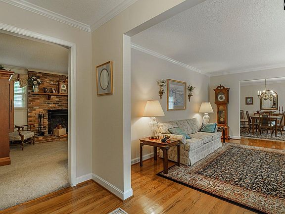 Very well-maintained BRICK ranch offers so much in a great location for so very little! You will instantly love the extra off street parking and large turn around making easy access in and out for you and your guests. The front door with circular front steps welcomes you into the foyer with hardwood floors and crown molding. To your right is the large formal living room and dining room both with hardwood floors and more crown molding. Moving into the home you'll appreciate the very large den with masonry, gas log fireplace, updated carpets and extra large sliding door that opens to the over-sized backyard and patio. The eat-in kitchen sports a free-standing, self-cleaning electric range, dishwasher, over the stove microwave, and disposal. The French door refrigerator with freezer drawn remains with the home along with the washer and gas powered dryer. The laundry is in the mud room where one enters from the one car garage with updated opener. Three bedrooms and two updated baths with tiled floors. Owner's suite offers a walk-in closet and updated tiled shower. Many updates are included: recent roof, new water heater, energy efficient replacement windows, updated flooring: tile, vinyl and carpets and more. Don't miss this jewel!
