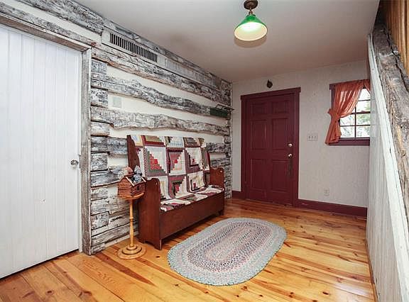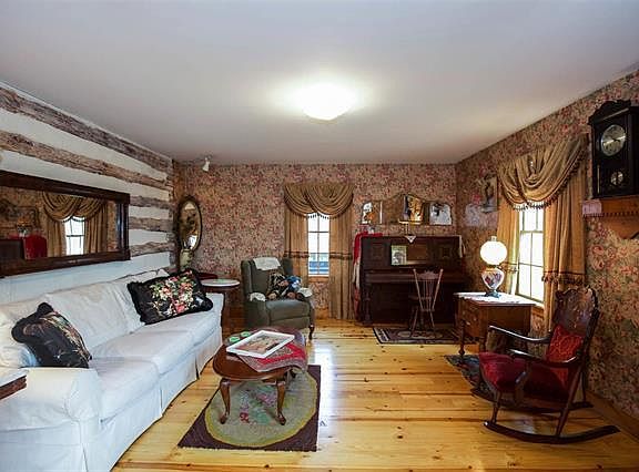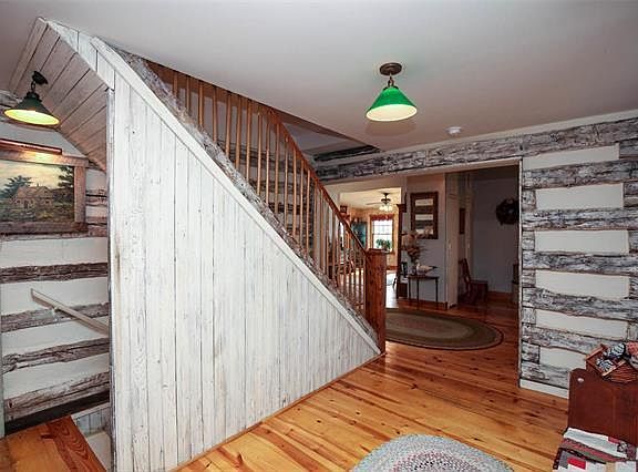 Don't miss a chance of a lifetime! Spectacular custom built home hand built by the current owner using logs from an 1890 log cabin. The attention to detail, creativity & outstanding craftsmanship is a must see! Covered front porch & beautiful landscaping welcome you to the foyer where the staircase w/handcrafted spindles leads you upstairs to a 16x8 sitting area, 2 bedrooms & full bath. On the main floor is the master bedroom, w/custom made bathroom door, kitchen & dining room w/cathedral ceiling, formal living room & sunrm that leads to covered area w/an amazing view overlooking 3+ acres. Yellow pine hardwood floors, main floor laundry & central vac. The basement boasts over 1000sqt ft of living space w/family rm, free standing wood stove, game room or office, 15x13 craft rm, ½ bath, 12x17 garden room full of windows w/walk-out to covered deck, wood & garden sheds & a log cabin playhouse for the kids! 3 car garage has huge heated woodworking shop. SO MUCH MORE-THIS IS A MUST SEE!