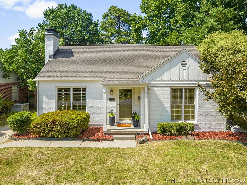 A charming, brick cottage near Utica Square & Cherry street on quiet street w/deep lot & xl one car garage great for storage. Primary bdrm offers French doors to covered patio, Spacious living w/ Gas Log Fireplace, lots of natural light, kitchen open to dining, W/D in hall bath, bonus space is pull down stairs to an attic area finished w/carpet & drywall perfect for storage or hobby room. Most windows updated, wood flooring, original crown, trim & base moulding. HVAC heat pump unit new 207. Loved by current owner 14+ yrs!