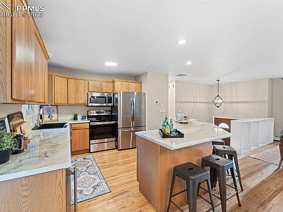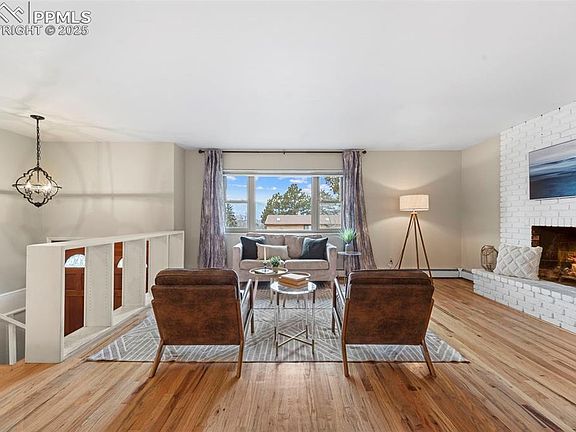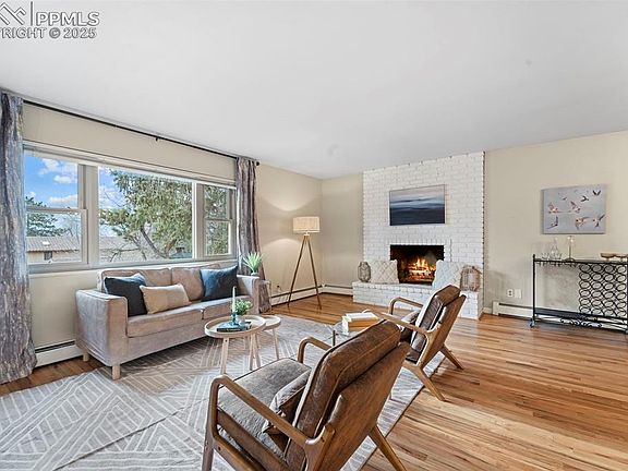 Nestled against the bluffs of Palmer Park, come and explore this unique and charming 5 bed/ 3 bath/ 2 car garage home. The property welcomes you with a fenced front yard featuring a garden, gazebo, NEW exterior paint and a NEW roof. At the front, large double doors open to a space that's far from your average cookie-cutter layout. Inside, discover a spacious open-concept space with mountain views from the large living room window. The upgraded kitchen, living room, and dining room flow effortlessly together, creating a great space to entertain or relax with loved ones. Wood floors extend from the kitchen into the living room and dining area, perfectly framed by a floor-to-ceiling brick wood-burning fireplace. The kitchen boasts a large island, stainless steel appliances (including a wine cooler), epoxy countertops, and ample cabinet space. The main level also features a private master bedroom with an en-suite 3/4 bathroom, two additional bedrooms, and an upgraded full bathroom. Off the kitchen and dining area, original wood-carved double doors lead to a separate wing with access to an exterior deck. In this wing you will find a large office with built-in shelving, and a non-conforming bedroom or second office. Moving downstairs, you'll find a garden-level basement with a second floor-to-ceiling brick wood-burning fireplace. The space opens to a large family room which is ideal for game nights or movie nights. Past the family room you will find an additional gathering space with access to a walk-in safe! The lower level is complete with a 5th bedroom and updated 1/2 bathroom (which once was a 3/4th bathroom and could be converted back to one!) This home also features an oversized lot. Enjoy the large front yard or fence in the huge backyard – that is currently being used for parking – of the lot for additional space to play or garden. Truly one-of-a-kind you will love exploring all the features of this unique home. Don't wait—this one won't last long!