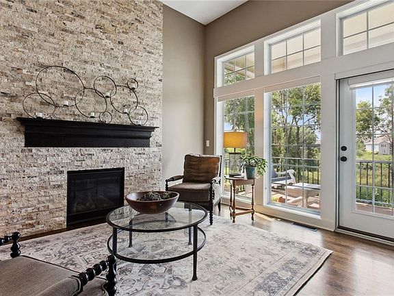 Luxury Living at Staley Farms! Enjoy serene views overlooking the golf course and a beautiful lake from your covered deck. This remarkable reverse features open-concept living and dining areas, with hardwood floors throughout the main level. The modern kitchen boasts a gas range, Bosch dishwasher, granite countertops, soft close doors, and convenient pull-out shelves. This unique floor plan extends 15 feet longer than the original reverse floor plan and includes a beautiful hearth room, perfect for entertaining. Custom built mantels hang over two fireplaces, both with auto blowers. The Primary bedroom is located conveniently to allow for true one-level living and the Primary bath features a luxury zero-entry shower for ultimate relaxation and ease of use. The walkout, finished lower level includes an en-suite bedroom, wet bar, bonus room PLUS a large storage area. Maintenance provided living at its finest! HOA includes snow removal, lawn care, sprinkler, building maintenance (stucco, paint and roof) and structure insurance. Exterior painted summer 2023. Close to shopping, dining, entertainment and the airport!