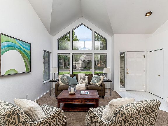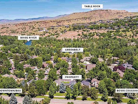 Highly desirable location in Spring Meadow Sub. The Greenbelt and Boise River are steps away! Open, airy floor plan, lots of natural light. Living and dining areas with soaring ceilings and big windows. Great kitchen with lots of cabinets, tiled flooring, breakfast bar, pantry & white appliances. Family room with fireplace & patio access. Nice vaulted master suite with fireplace, dual vanities, walk in closet and oversized shower. Walking distance to schools, shopping and Bown Crossing.
