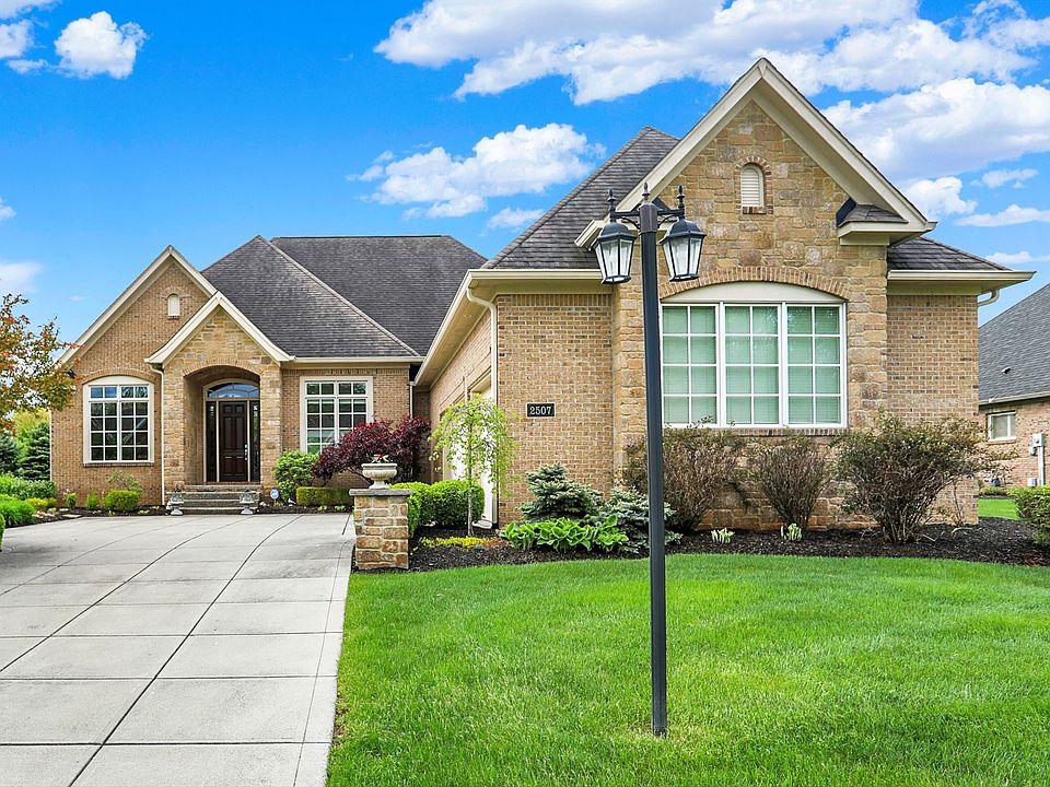Enjoy low-maintenance living in this well-maintained, custom-built ranch in desirable Camden Walk. Enter into a light, bright, open floor plan with beautiful bamboo wood flooring, 10'+ ceilings, and abundant windows. Lovely four-season sunroom. The Gourmet kitchen offers walk-in pantry and stainless steel appliances. Granite counters in the kitchen, baths, and laundry room. All appliances remain, including washer & dryer. The split BR floor plan offers privacy for the primary suite tucked away to one side of the home. 2nd ensuite BR + Den. Enjoy entertaining in the full daylight basement with rec room. 9' ceilings, wet bar, 3rd bedroom + full bath, unfinished space is great for storage, plus many storage closets throughout. HOA covers mowing, edging, mulching beds, pruning, irrigation system, snow removal on street, sidewalks & front porch.