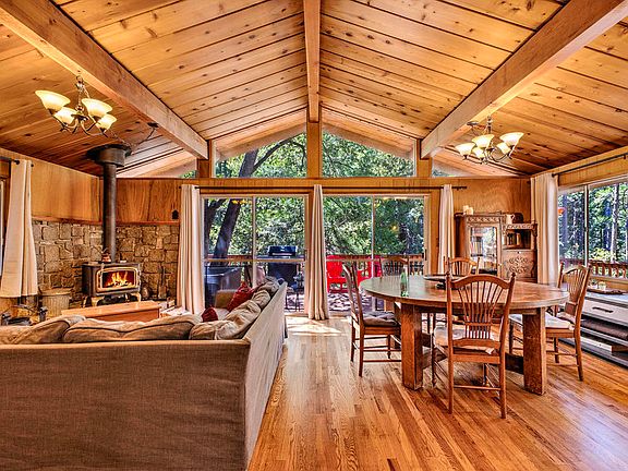 This mid-century Family Heirloom has never been offered for sale. Second home from the end of the rutted road, there is a sense of being lost in the forest and it feels so good. Back in the early sixties, (1961) Grandma had it built for a family retreat, 2 bedrooms, 1 bath and lots of decking. In the late 90's it grew, now 3 bedrooms 2 baths and an office, just over 1400 sq ft. The Great Room encompasses a wall of windows looking out into the woods, informal Dining adjacent to the modest but well equipped kitchen with lots of cabinets and counters, The back deck is suitable for al fresco dining, a jacuzzi soak, just steps away strawberry creek cascades over giant granite boulders, splashing into crystal clear pools. There are even patches of prized lemon lilies. A must consider if you're looking for creek frontage ownership.