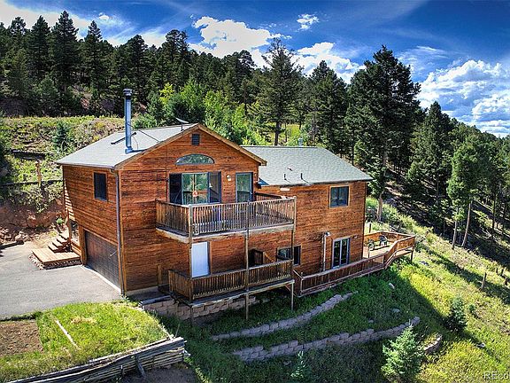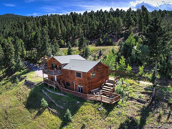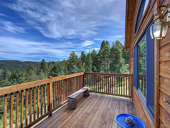 Views, views, VIEWS! Add in an open floor plan and 5 treed acres for privacy and you've found a very special home. Great room features a deck for morning coffee and dramatic sunrises, huge windows to bring the outdoors in, and a wood stove for enjoying evenings at home. Large kitchen and great room are a perfect set up for entertaining. Large primary bedroom has a nook for an office or cozy sitting area, large walk in closet, and full primary bath which may also be accessed from the main hall. Tons of storage on the lower level along with two additional bedrooms and another full bath. One of the bedrooms has a walkout making it an ideal studio, office or garden room. Both currently used as offices for work at home. Lots of outdoor deck and living space to enjoy the view plus a garden area. 50-year roof installed 2011, new pressure tank in 2016 and an included Starlink dish for high speed internet are just some of the additional features you’ll find. South facing, paved driveway makes the coming winter much more pleasant and county maintained roads provide easy access to 285. 5 minutes to Beaver Ranch Park featuring great trails and a disc golf course, 10 minutes to groceries and restaurants, and only 40 minutes to downtown Denver or the Tech Center.