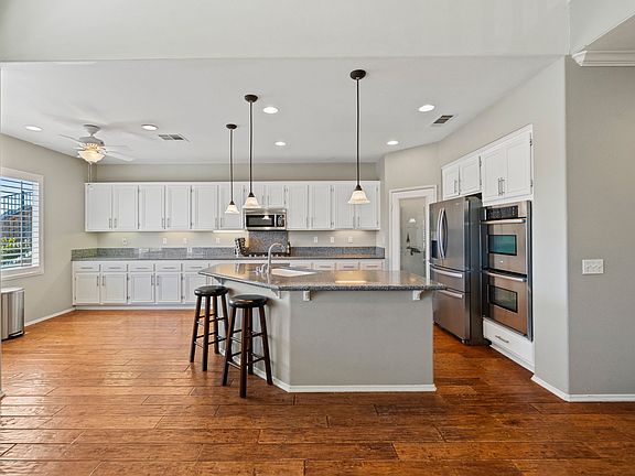 This 4 bedroom home in Menifee with SOLAR has 3 full bathrooms and a half bath for guests. The kitchen is fully upgraded with stainless steel appliances, including a double oven, and granite counters. The kitchen opens up to the large family room and kitchen nook with access to the back patio. There are other upgrades, such as plantation shutters throughout and hardwood flooring downstairs. All bedrooms are on the first floor. The primary bedroom has a door to access the back patio and a walk in closet with custom built-ins. The primary bath has dual vanity and separate tub and shower. Both the living room and the family room have fireplaces. There is a huge loft upstairs as well as one of the full bathrooms. The loft includes a pool table for your enjoyment. The loft and stairs have carpeting. The backyard has a covered patio and is low maintenance. Tenant responsible for $150 monthly solar payment. Additional $400 Pet Deposit if pet approved by owner. Tenant responsible for monthly solar payment of $150. Qualifications: Income must be 2.5 times the rent. No evictions. No more than 3 negative items on credit report. No late rent payments in the past 2 years.