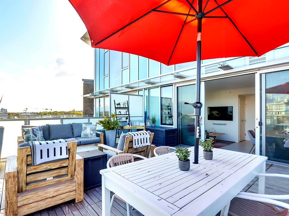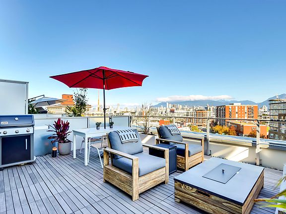 Penthouse skyhome at The Independent! Enjoy Panoramic views of downtown, the North Shore Mountains & epic sunsets from the unit or your 400+ sq feet dream patio. The 2 level home features 2 large bedrooms, a den and 2 ensuites on the upper floor. The main level has a sunlit kitchen, living/dining, an additional 3rd bathroom and dual sliding doors to the patio. The podium homes at The Independent enjoy the luxury of a separate lobby and elevators from the tower units for only a handful of units. Building amenities including a central courtyard, dog run and wash area, gym, party room, workshop and guest suite. Upcoming Main & Broadway skytrain station minutes away from your front door, along with every Mt Pleasant hot spot you can name. Air Con, XL parking and a huge locker included.