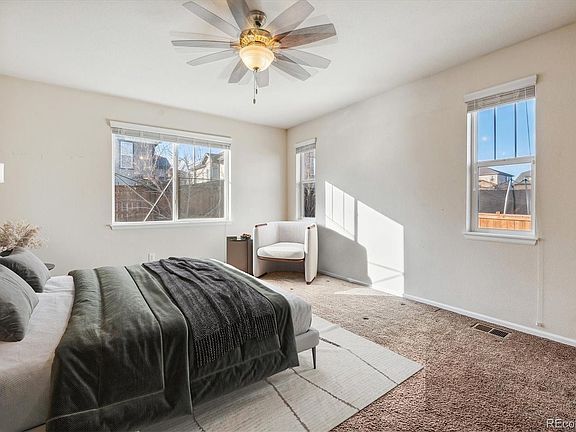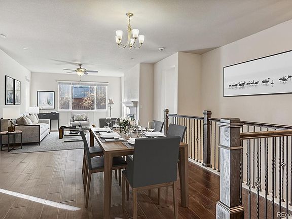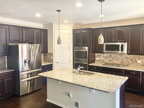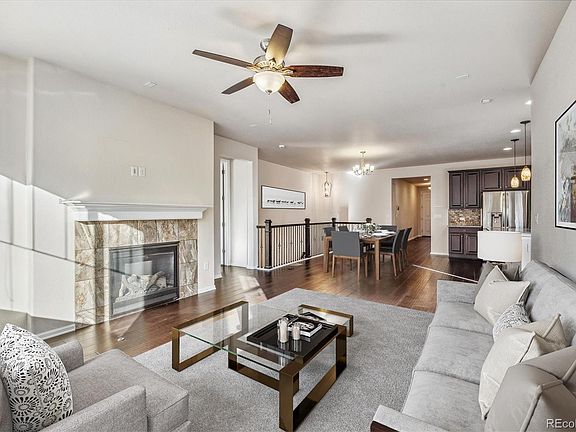 This 5-bedroom, 3-bath, feature-rich ranch-style home in Traditions of Aurora, is move-in ready! The main level has an open concept design with 9' ceilings and 8' doors. It has 7" wide plank-engineered hardwood flooring in the entry, kitchen, dining area, and great room. The great room on the main level is pre-wired for surround sound and has a gas fireplace. For the chef, the gourmet kitchen offers 42" cabinets, granite countertops, and stainless steel appliances including a double oven and a 36" cooktop. The home is wired for data with a Cat5E data package upgrade. The primary bedroom with a large walk-in closet and a 5-piece en suite bath is separated from the other two main-level bedrooms for additional privacy. This home features a builder-finished basement which includes 2-bedrooms with walk-in closets, a bathroom, and a large family room with a pool table included. The family room in the basement is pre-plumbed for a wet bar, is also pre-wired for surround sound, and has existing ceiling speakers that will stay. In the storage/mechanical room you'll see an upgraded HVAC system which includes a built-in humidifier and air purifier. The home also has a radon mitigation system, a water treatment system, and a sump pump. On the outside, you'll find a covered porch in front, a 10' x 16' covered patio in the back, and a Marquis Hot Tub. The 3 car garage is very convenient for that extra auto or unlimited storage options. The Ion Solar System will help reduce energy costs and will be free and clear at closing. All appliances stay including the washer and dryer. Close to Traditions Skate Park, Vista Peak Exploratory and Preparatory schools, pool, clubhouse, and trails. Easy access to E-470, and I-70, and close to DIA, Buckley Air Force Base, & retail shopping. Virtual staging.