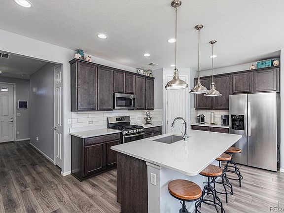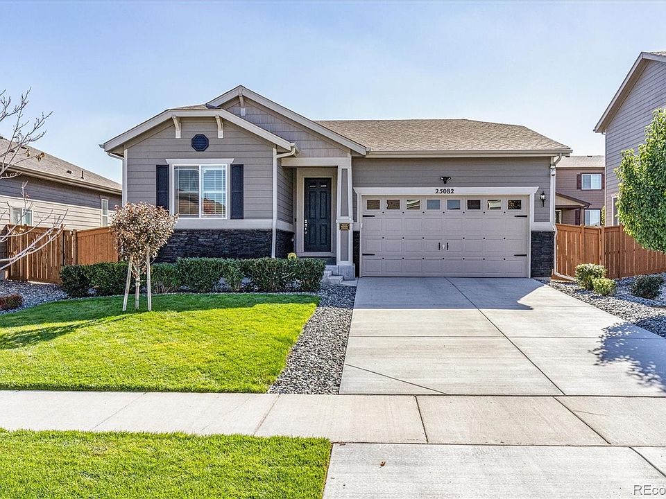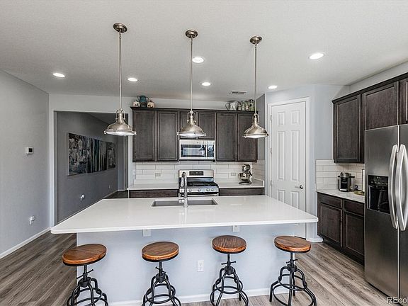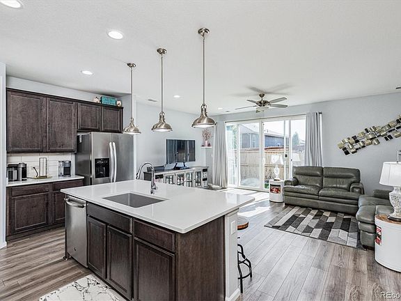 Looking for one level living? This move in ready ranch boasts abundant upgrades and tons of ambient light. Welcome inside to 8' doors, plantation shutters and upgraded luxury plank flooring that extends from the entry into the open kitchen and great room. The warm color pallet incorporates smoke gray cabinets with 42" uppers, Quartz countertops and a white subway tile backsplash for contrast. The generous island is ideal for prep or entertaining with bar seating and stylish pendant lights. You will enjoy changing the colors of the LED lighting at the bar and under the cabinets to match your mood! Stainless steel appliances include gas range, microwave and dishwasher plus there is a corner pantry for additional storage. Spacious great room has access to the fully fenced backyard with immaculate landscaping. Imagine relaxing on the expansive patio with useful rubber coating and enjoying a beverage under the retractable awning. The lush lawn is surrounded by curbed edging and privacy fence. Master features a walk-in closet and newly remodeled Jacuzzi shower with bamboo seat and transferable warranty. Secondary bedrooms utilize the full hall bath with pebble deco tile at the large shower. Note the handsome curb appeal and Jellyfish lighting at the exterior so you are ready for every holiday, event and season! Other details include central air and surround sound pre-wire. Located in a pool community near schools, DIA.