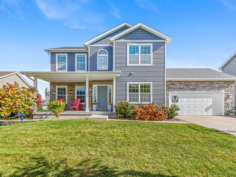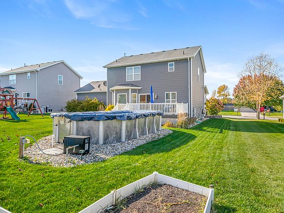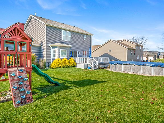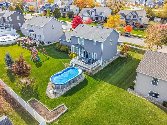 Welcome to this beautiful 3-bed, 3-bath, 2-story home! This home offers a charming front porch with gorgeous landscaping, a bright open-concept layout with a two-story foyer, high ceilings, and bamboo flooring throughout. The kitchen features quartz countertops, all appliances included, and a stylish backsplash, opening to the living and dining areas for easy entertaining. Upstairs, you'll find three spacious bedrooms, including a primary suite with dual sinks and a large walk-in closet, plus the convenience of an upstairs laundry room. The full unfinished basement provides over 1,000 sq. ft. to customize and make your own. Step outside to a backyard oasis with a Trex deck, a 12x24 heated pool, and plenty of space to relax or entertain. Conveniently located near shopping, restaurants, and just 45 minutes from downtown Chicago! Don't miss your chance to make this beautiful home yours!