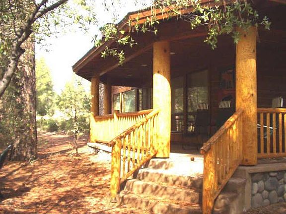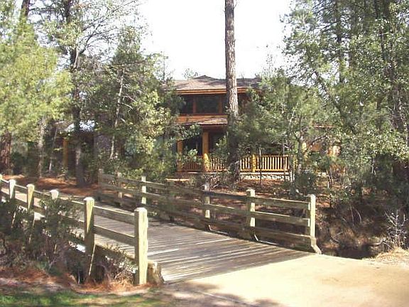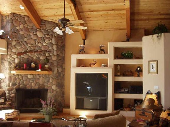 Nestled in huge pine trees overlooking the 17th fairway w/beautiful log accents & stone fp. Everything you need is on the main floor. Gigantic GREAT ROOM w/high wood beamed ceiling & built-in entertainment center, stone fp, red oak floors, knotty alder doors, oak cabinets, & granite countertops. Baths & walkways have travertine tile on floors & tumbled marble countertops. Beamed ceiling in office Too many upgrades to mention. Pinon membership incl.