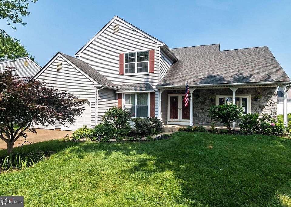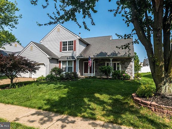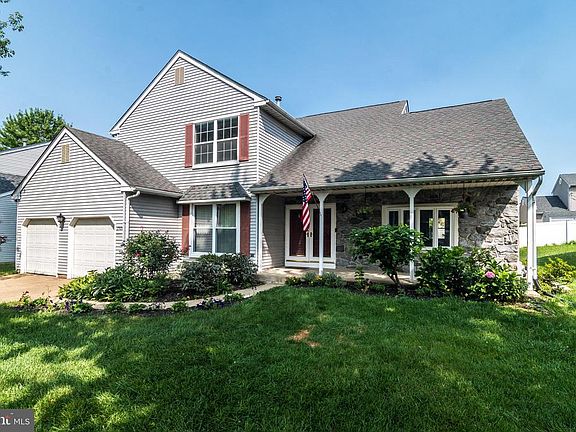Largest model in Village Green. All 4 bedrooms are upstairs. Freshly painted and all new carpet throughout. To the left as you enter is a first floor office and across the hall is the Living room dining room that steps down to new laminate hardwood floors and soaring ceilings. Mostly newer windows on first floor. Kitchen is open to breakfast room and family room. Newer EP Henry patio out back that has 12" gravel underneath the patio for potential addition of a sunroom. Lining the perimeter property lines are Pear, Apple and Peach trees. Roof approximately 10 years old. In family room there is a wood burning fireplace. Powder room tucked away off family room and convenient first floor laundry area. Above 2 car garage is a partially floored attic. Newer Hot Water heater. 14 Seer HVAC installed in 2005. Basement has been partially finished and has a handy utility sink for all the messy cleanups. The upper floor has 4 generous size bedrooms. The master suite features a luxurious bathroom with a jetted tub.
