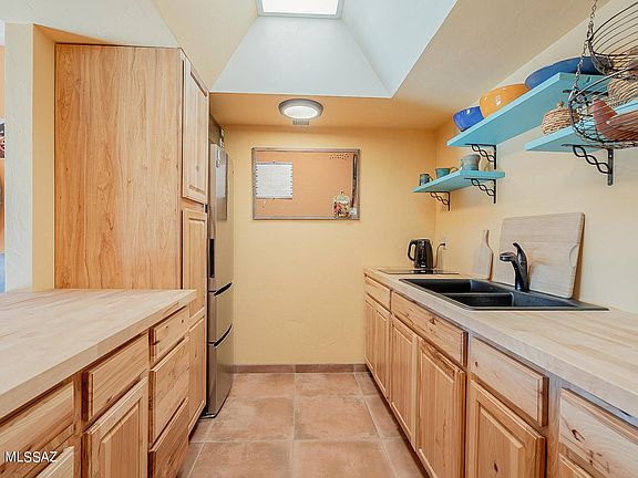 * Minimalist Living at its Finest! Must See! Furnished, remodeled townhome maximizes space and utility for a spacious and serene look and feel! Add to this the expansive views of a desert arroyo, a golf course and majestic mountain views makes this the perfect casita for your new carefree desert lifestyle! This home features a light and bright extended foyer with skylight and tile floor throughout. Remodeled kitchen features new cabinets, butcher block counter with 2-burner inset cooktop, decorative shelving and skylight. Efficient recessed handleless freezer/fridge has chiller drawer extending food freshness! Pass-through to living room adds beauty and functionality while bringing living room outdoor views into the kitchen!