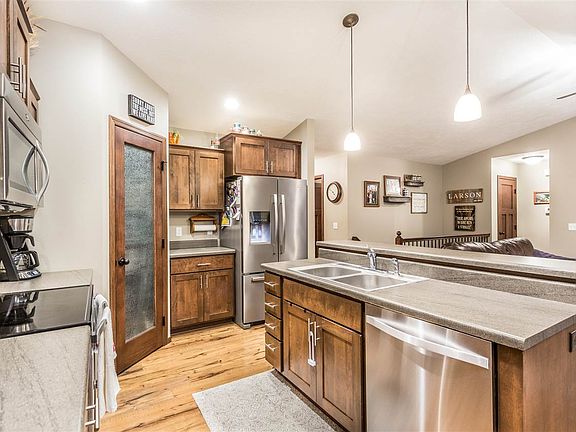 Phenomenal West side location only a block away from a Tea elementary school and a eight acre development pond - this ranch home has everything your family desires. 4 beds - 3 baths (master bath) - large 3 stall garage with H/C water hookups. Open plan with vaulted ceilings, kitchen island/breakfast bar, corner pantry, laminate flooring, stainless appliances and main floor laundry. Lower level has a large family room, tons of storage, 2 more large bedrooms and a full bath. Outside find a great front covered porch, large deck out back, landscaping and underground sprinklers.